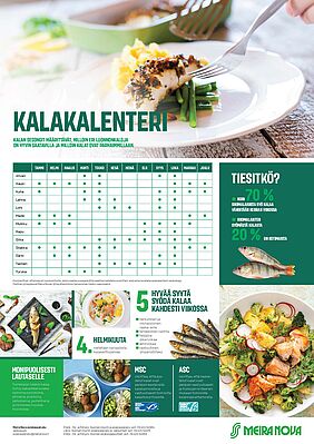 Kalakalenteri löytyy Nova-lehden 6/25 välistä sekä sähköisenä Meira Novan nettisivuilta meiranova.fi kohdasta Tuotteet -> Tuotekuvastot ja kalenterit. Lisäksi sitä jaetaan esimerkiksi tapahtumissamme. Kalenterin voi laittaa työpisteellä seinälle, jolloin se on nähtävillä esimerkiksi ruokalistoja suunniteltaessa.