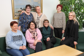 Kuvassa vasemmalta tuotetietoasiantuntija Nina Jäntti, tuotepäällikkö Anne Sandberg, tarjouslaskija Sanna Kilpeläinen, valikoimahallintapäällikkö Kati Korhonen, valikoimasuunnittelija Maija Nurmi, tuotetietoasiantuntija Milla Raenmaa ja valikoima-assistentti Iina Loikala. Kuvasta puuttuu tuotetietoasiantuntija Ancelika Pensanen.