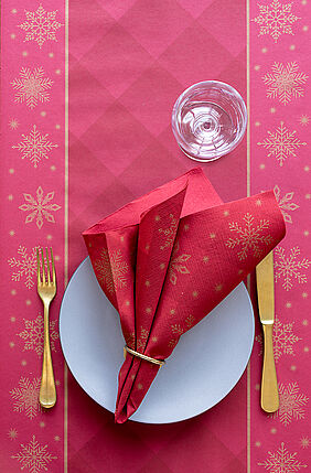 ”Veikkaan, että Rhombus-sarjamme viininpunaiset lautas- ja poikkiliinat ovat tämän vuoden juhlakauden hitti”, Dunin myyntipäällikkö Pia Stenström sanoo. Rhombus-liinat ovat hyvä esimerkki siitä, millaisia lautas- ja poikkiliinoja ravintolat valitsevat pöydilleen joulun aikaan ja muulloinkin. Rhombus-liinoissa on yksi taustaväri, jonka päälle on painettu kultaisia tähtiä, lumihiutaleita ja viivoja.
